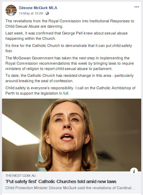 Introduced last year, The Children and Community Services Amendment Bill includes clauses which would require ministers of religion to report child sexual abuse even if it were disclosed during religious confession.